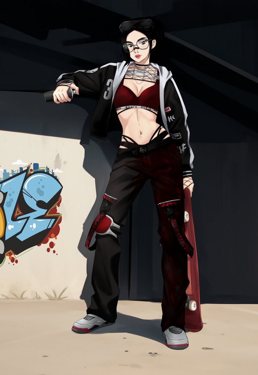 Goggles, Bandaids, Beanie, Glasses, Glasses Position Radial, Mask, Mask Position Radial, Chains, Choker, Jacket, Fours, Dunks, Puppy Tail, Puppy Ears, Skateboard